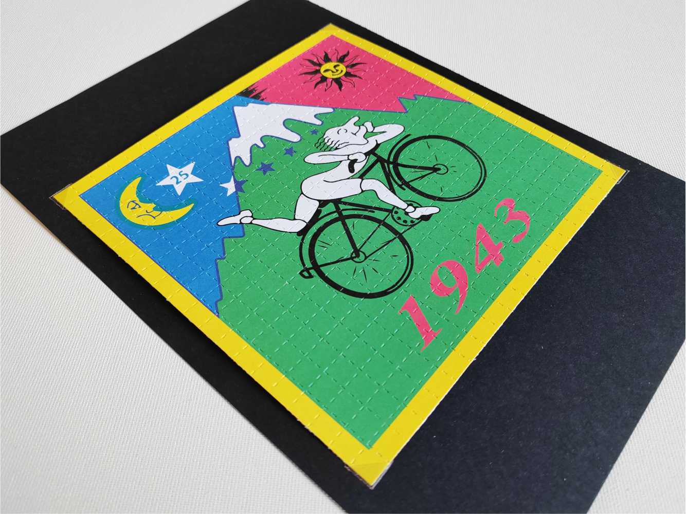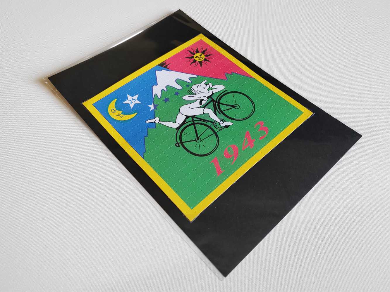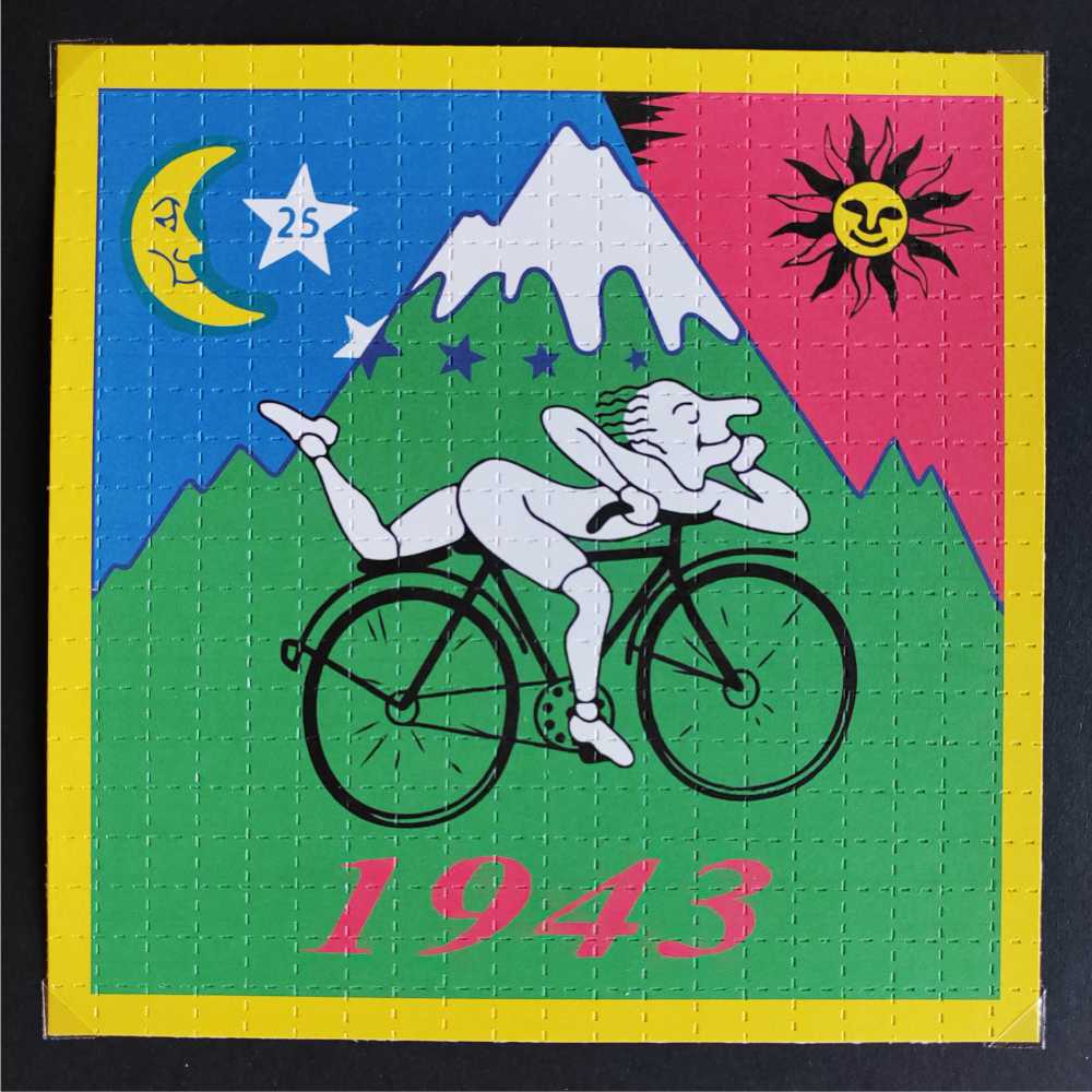 This “Bicycle Ride 1943” blotter is a XL-format version of the legendary design paying tribute to Dr. Albert Hofmann’s historic journey on April 19, 1943. On that day, after ingesting what he considered a very small dose of a newly discovered compound, Hofmann felt its first powerful effects and chose to ride his bicycle home through the streets of Basel. This moment became a foundational story in a certain countercultural movement, now celebrated globally as “Bicycle Day”.