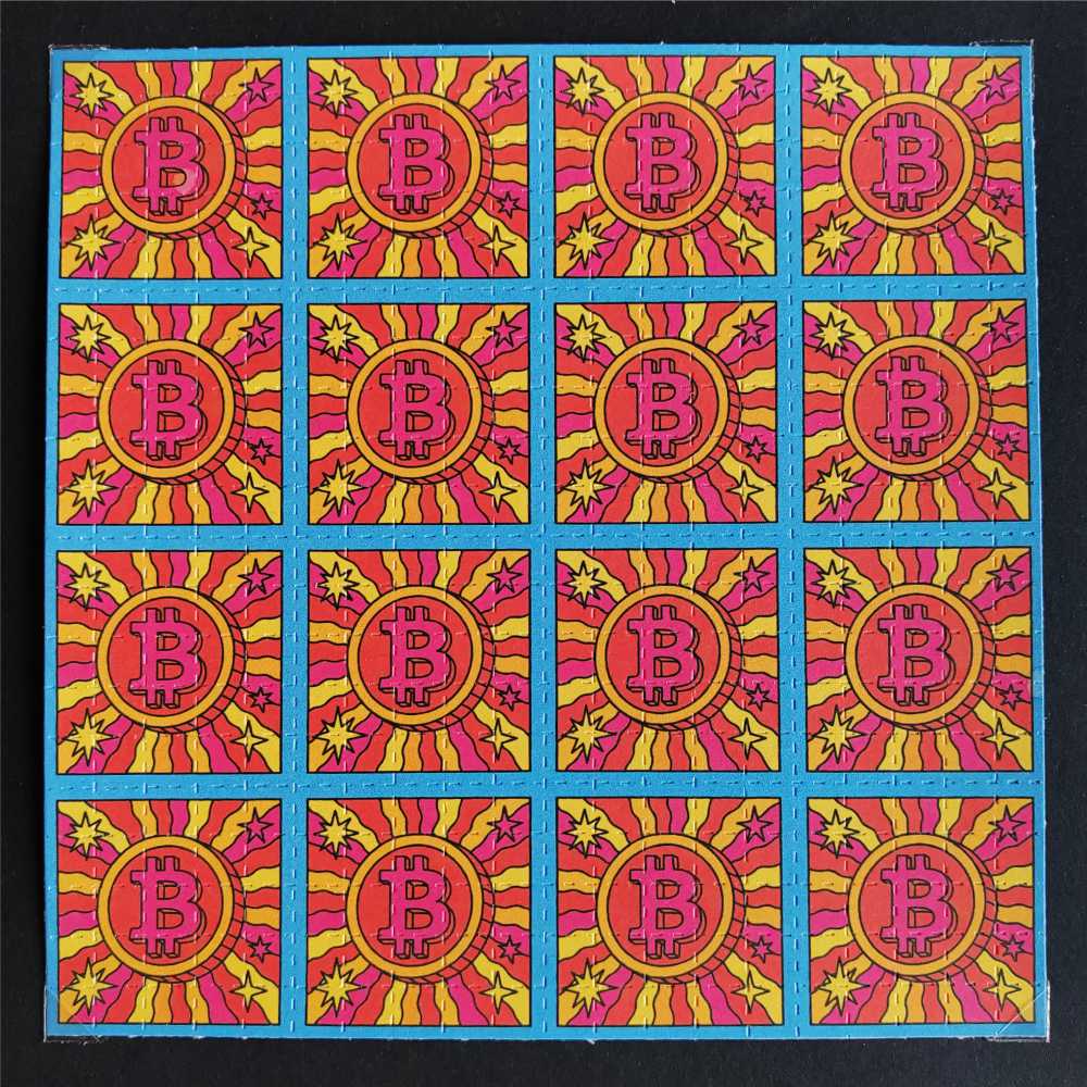 The “Bitcoin Small” blotter brings the same radiant pop-art energy as its larger counterpart, but in a more compact and collectible form. With its repeating sunburst design and the unmistakable Bitcoin logo at the center, it captures the spirit of the world’s first cryptocurrency in a format that feels both playful and powerful.