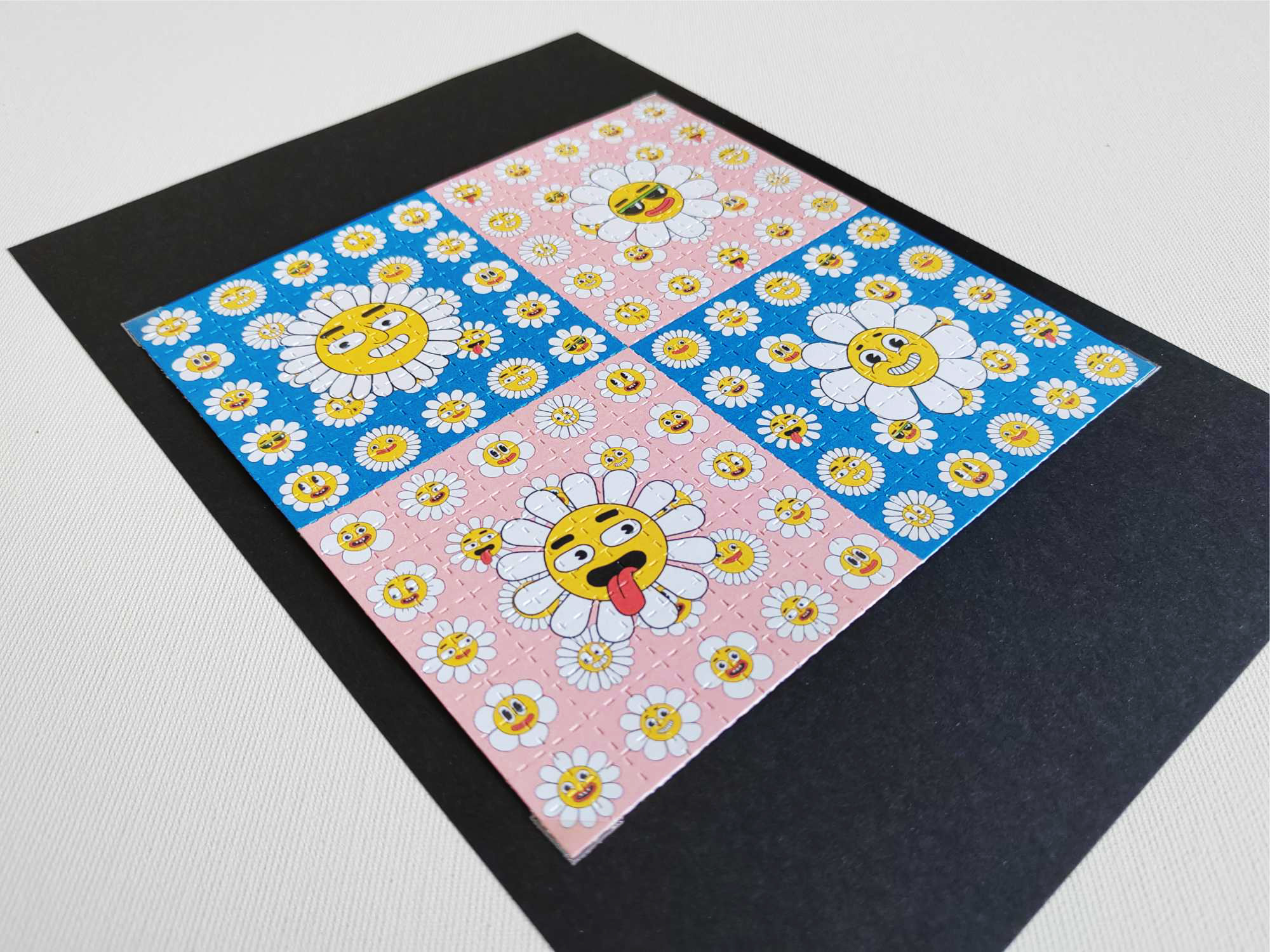 The “Happy Camomiles” blotter sheet is a delightful fusion of cartoon flower faces and dreamy pop art. Each square features daisy-like characters with expressive yellow faces surrounded by white petals. Their exaggerated expressions—smiling, sticking out their tongues, or wearing sunglasses—create a surreal and humorous visual experience. The alternation of blue and pink backgrounds adds to the whimsical, dreamlike atmosphere.