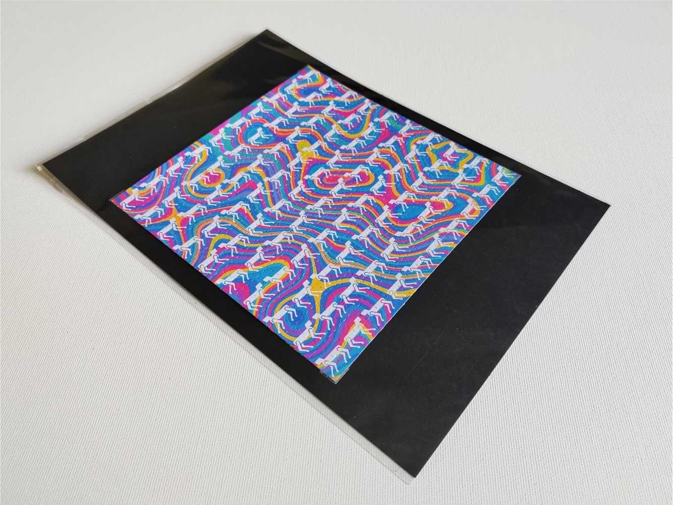 Delux packing: The blotter is mounted onto an A4-sized black photo board using transparent photo corner stickers and placed into a BOPP celophane sleeve with hanging hole.